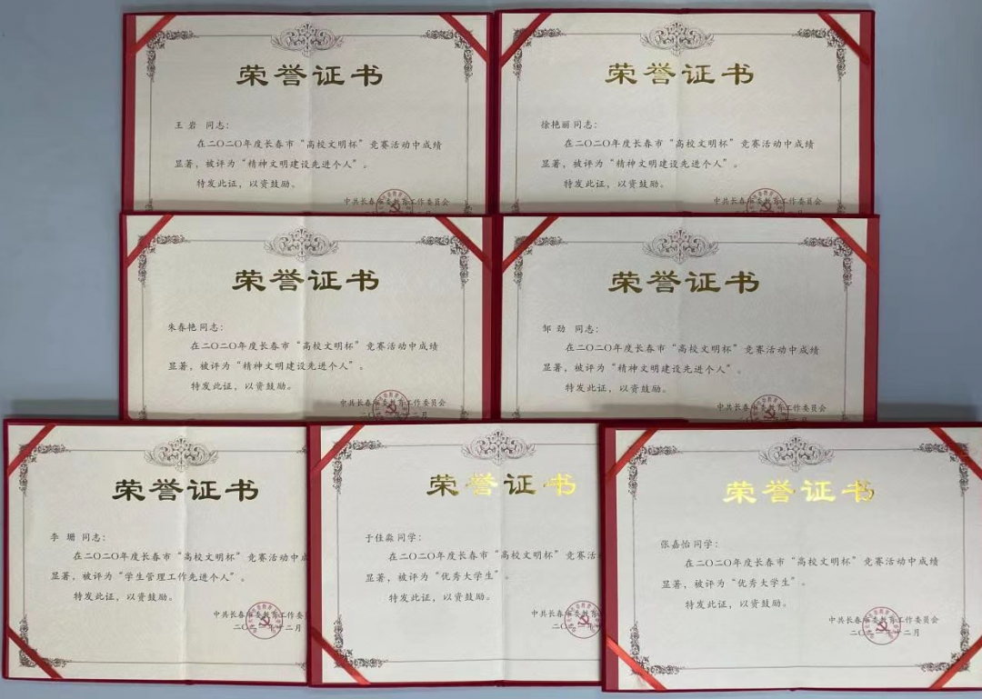 前不久,中共长春市委教育工作委员会对2020年度长春市“高校文明杯”竞赛活动先进集体和先进个人予以表彰,我校喜获“优胜单位”“平安校园”建设工作先进单位等15项集体和个人荣誉。