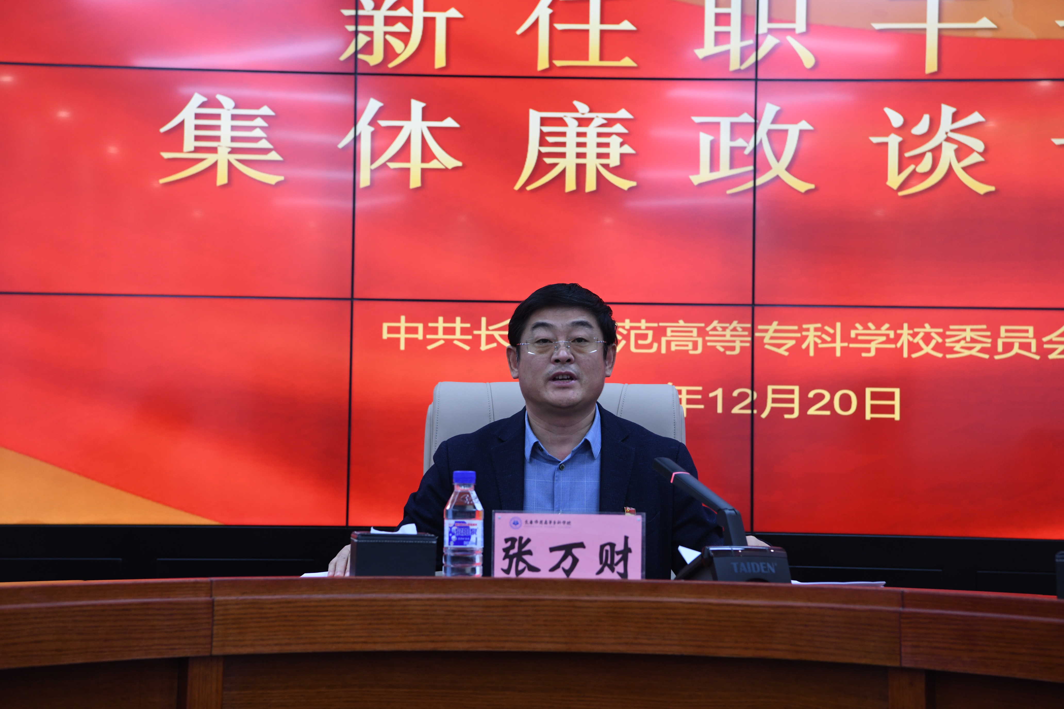 12月20日下午,学校召开了2023年新任职干部集体廉政谈话会。党委书记张万财出席会议并讲话。