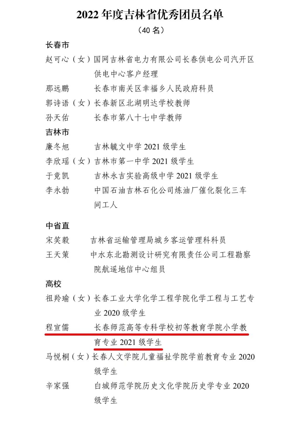 近日,共青团吉林省委员会发布了《关于表扬2022年度吉林省五四红旗团委、团支部和优秀团员、团干部的决定》,全省共选出40名“2022年度吉林省优秀团员”,我校初等教育学院21级小学教育专业3班程宣儒同学位列其中。