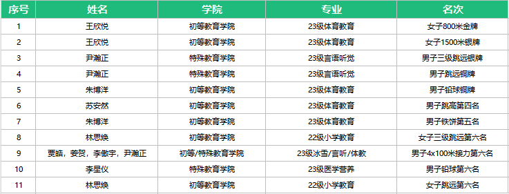 我校田径队在领队姚晓东老师和教练史博克老师的带领与指导下共获五枚奖牌,包括一金、两银、两铜。除此之外,还获得了一个第四名、一个第五名以及四个第六名的成绩。这些成绩的取得,不仅彰显了师专学子的竞技实力和团队精神,也充分体现了他们坚韧不拔与勇往直前的精神风貌。