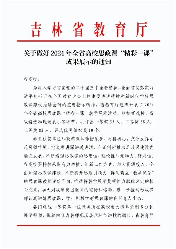 近日,吉林省教育厅公布了2024年全省高校思政课“精彩一课”教学展示活动结果,我校马克思主义学院教师荣获二等奖3项、三等奖1项。
