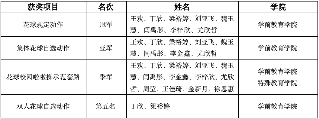 我校代表队在领队姚晓东老师、教练员刘畅老师的带领与指导下,在本次比赛中取得了高校丙组-花球规定动作冠军、高校丙组-集体花球自选动作亚军、高校丙组-花球校园啦啦操示范套路季军,以及高校丙组-双人花球自选动作第五名的优异成绩。