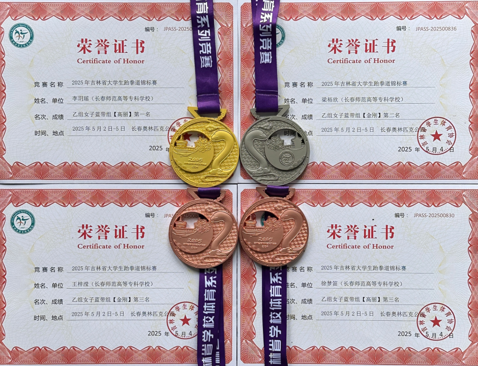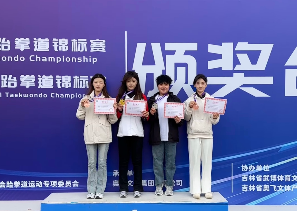 5月5日,2025年吉林省大学生跆拳道锦标赛在长春奥林匹克公园圆满落幕。本次比赛共吸引了来自全省35所高校的运动员同台竞技,我校23级学前教育专业梁裕欣、徐梦笛,党务工作专业李玥瑶,冰雪运动与管理专业王梓滢4名同学在许长鸣、冷昊展两位老师的带领下,斩获1金1银2铜的优异成绩,为我校争得了荣誉。