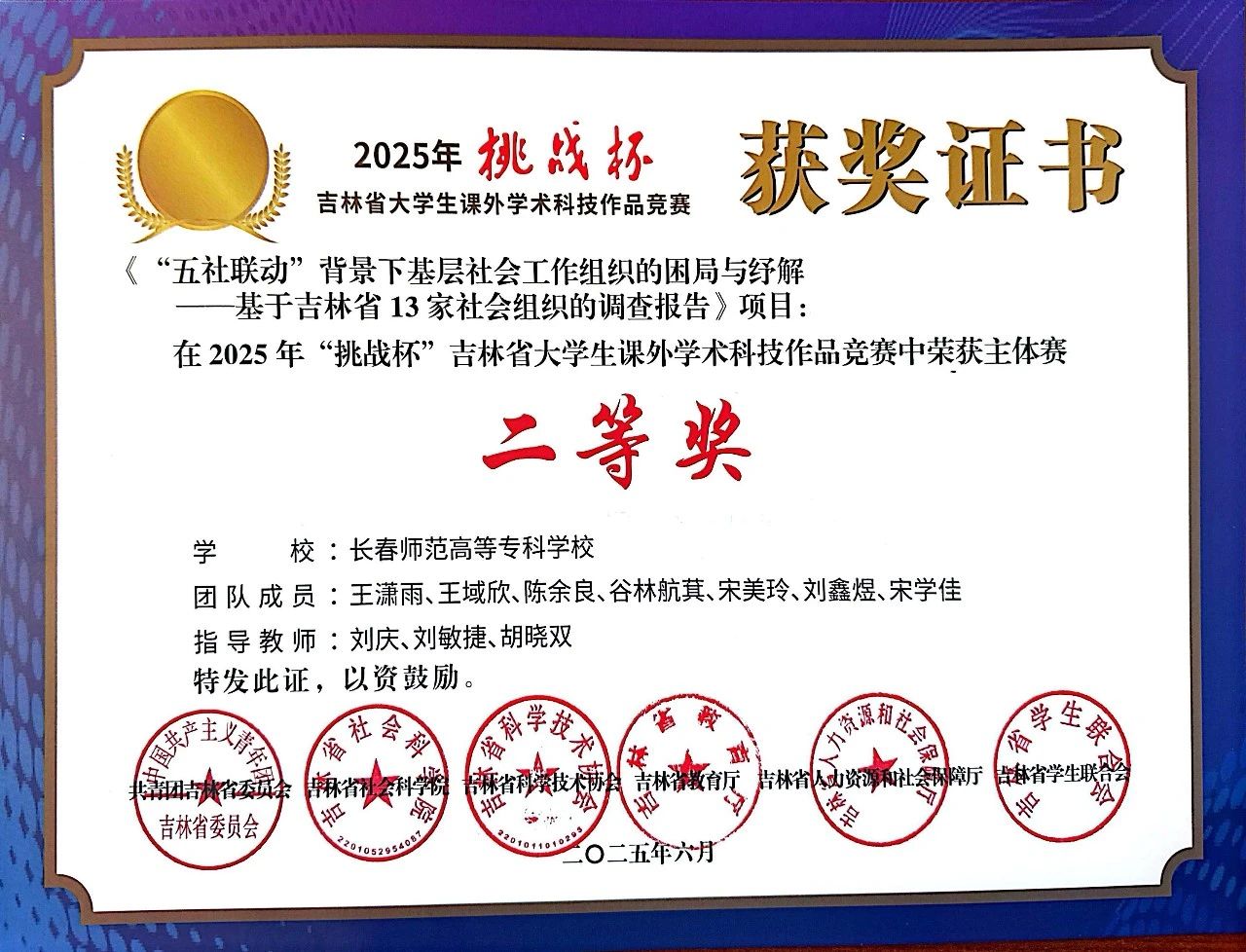 为深入贯彻落实科教兴国战略,全方位激发青年学子的创新创造活力,由共青团吉林省委员会、吉林省社会科学院、吉林省科学技术协会、吉林省教育厅、吉林省人力资源和社会保障厅、吉林省学生联合会联合开展的2025年“挑战杯”吉林省大学生课外学术科技作品竞赛评选结果公布。在此次赛事中,我校表现优异,荣获主体赛二等奖、三等奖各一项。