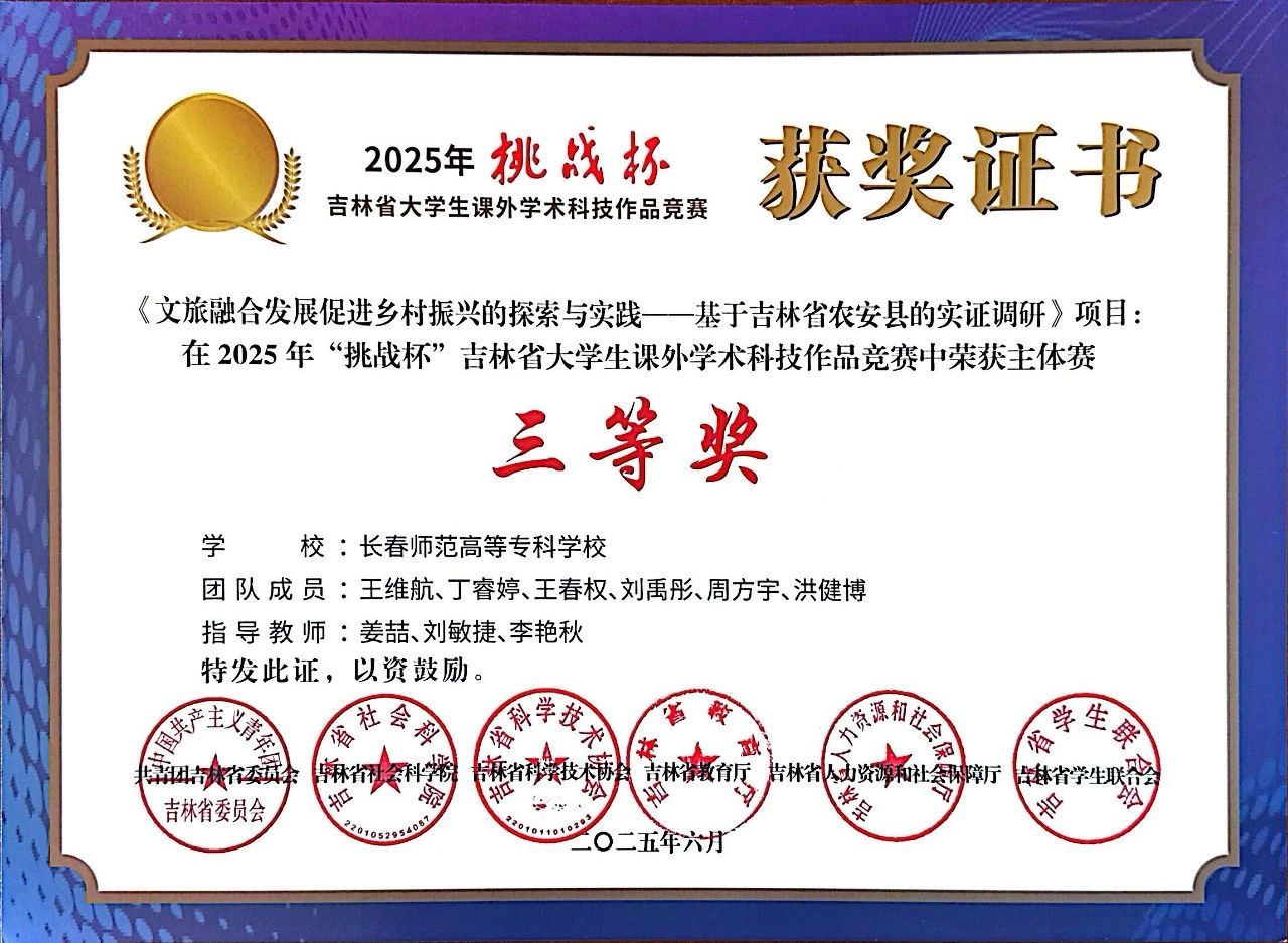 《文旅融合发展促进乡村振兴的探索与实践——基于吉林省农安县的实证调研》荣获2025年挑战杯主体赛三等奖。 项目以吉林省农安县“黄龙府”深厚的历史文化资源为切入点,创新探索文旅融合促进乡村振兴的实施路径。研究团队结合实地调研与文化创意设计,通过文化赋能、产业升级、人才培养三维联动,取得突破性成果。该成果已在农安县落地,带动旅游收入增长35%,提供就业岗位120余个,为同类地区提供了可复制推广的“文化+产业+人才”融合模式,彰显高校实践服务地方发展的价值。