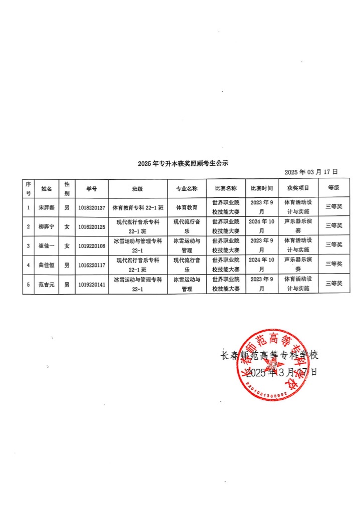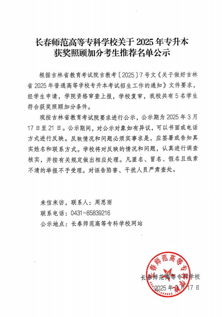 根据吉林省教育考试院吉教考[2025]7号文《关于做好吉林省2025年普通高等学校专升本考试招生工作的通知》文件要求,经学生申请,学院资格审查上报,学校复审,我校共有5名学生符合获奖照顾加分条件,现予以公示。