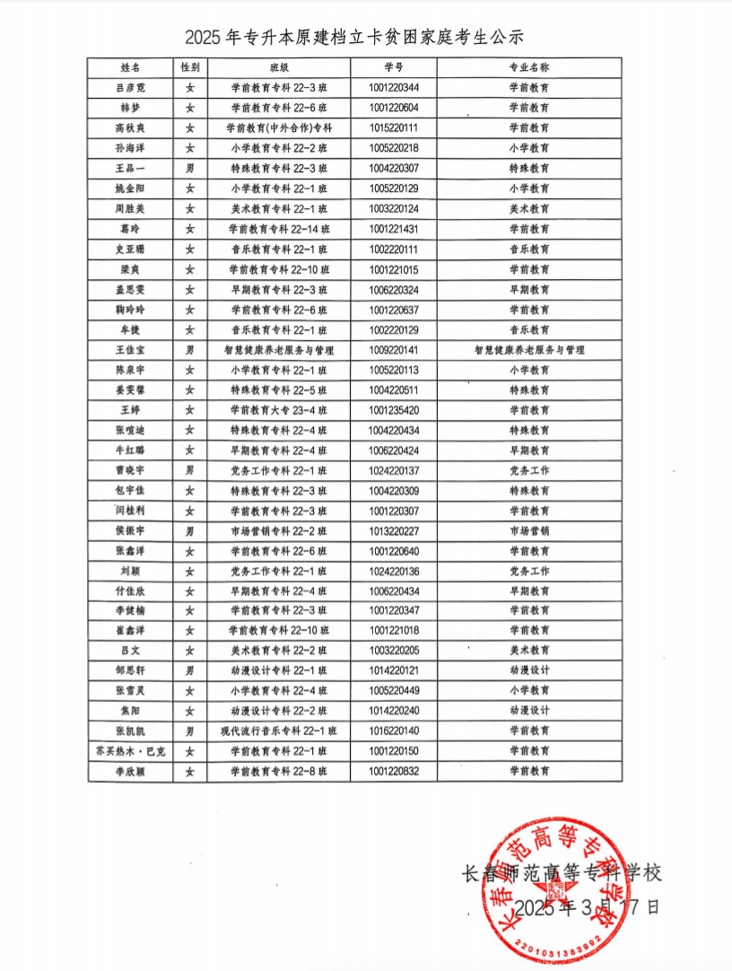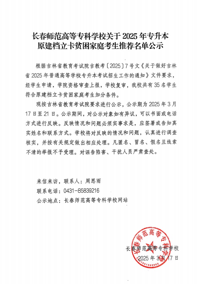 根据吉林省教育考试院《关于做好2025年普通高等学校专升本考试招生工作的通知》文件要求,经个人申请、学院初审、学生工作处(团委)复审,现将2025年专升本考试原建档立卡贫困家庭考生及获奖照顾考生校级审核通过的学生名单予以公示。